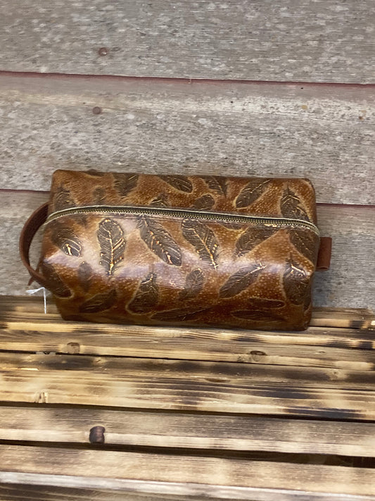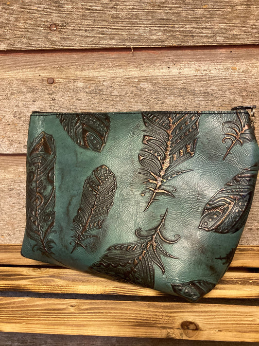 GREEN & BRONZE FEATHER EMBOSSED LEATHER COSMETIC BAG