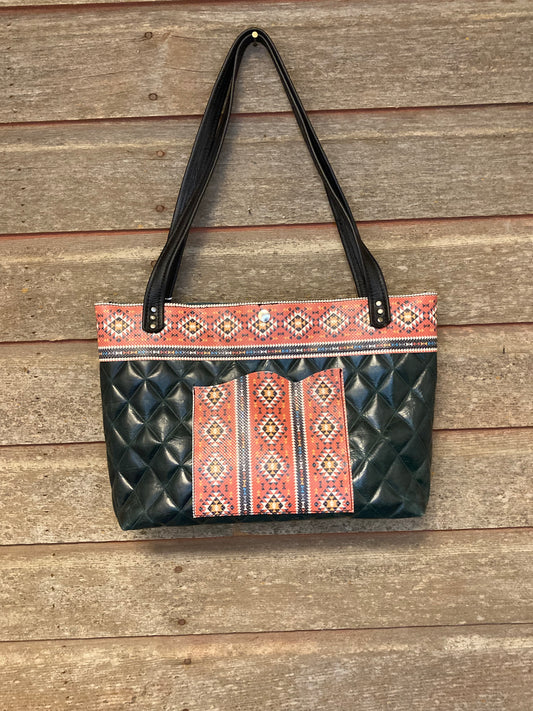 QUILTED GREEN AND RED AZTEC EMBOSSED LEATHER TOTE